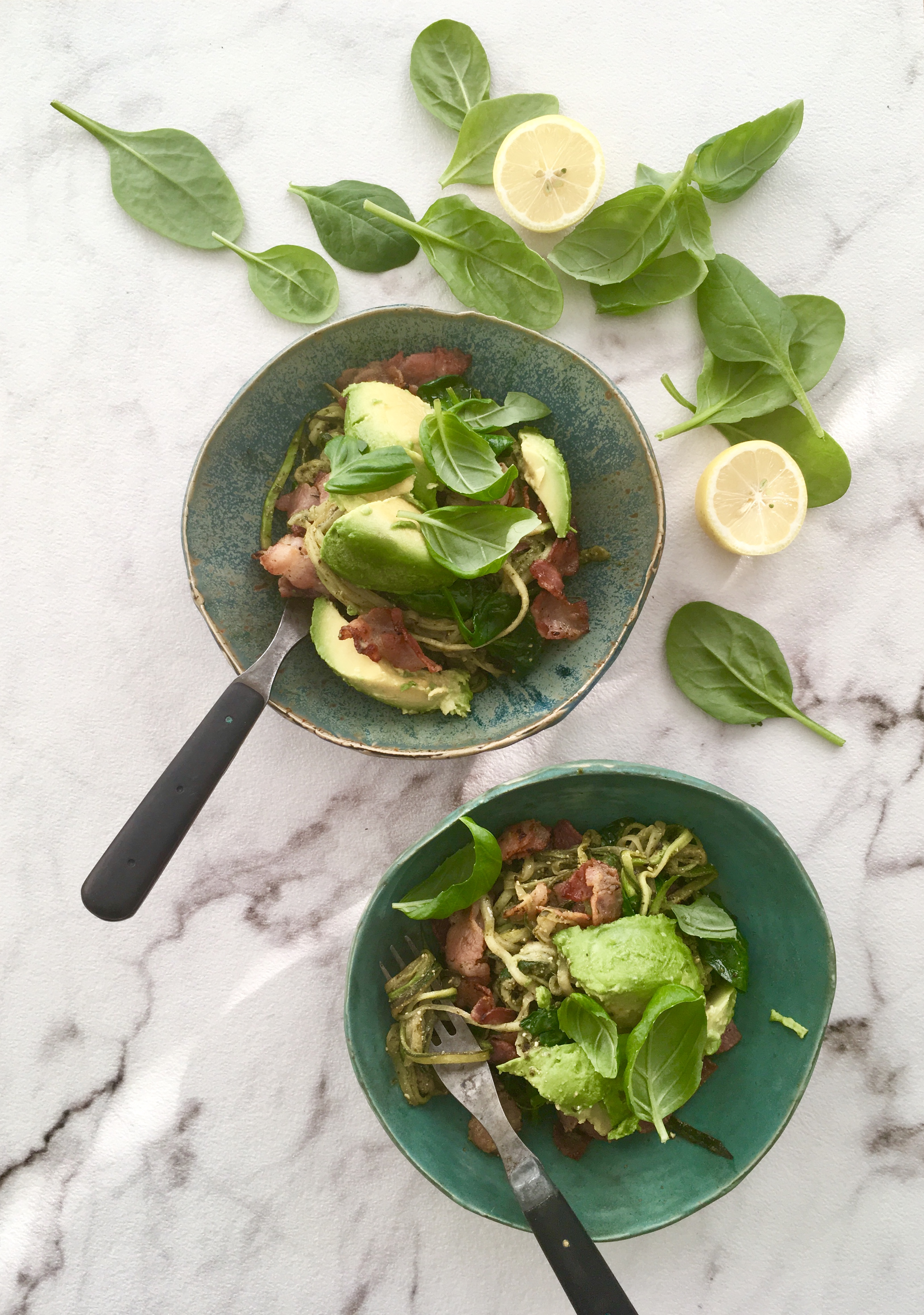 Pesto-kesäkurpitsaspagetti pekonilla ja avokadolla