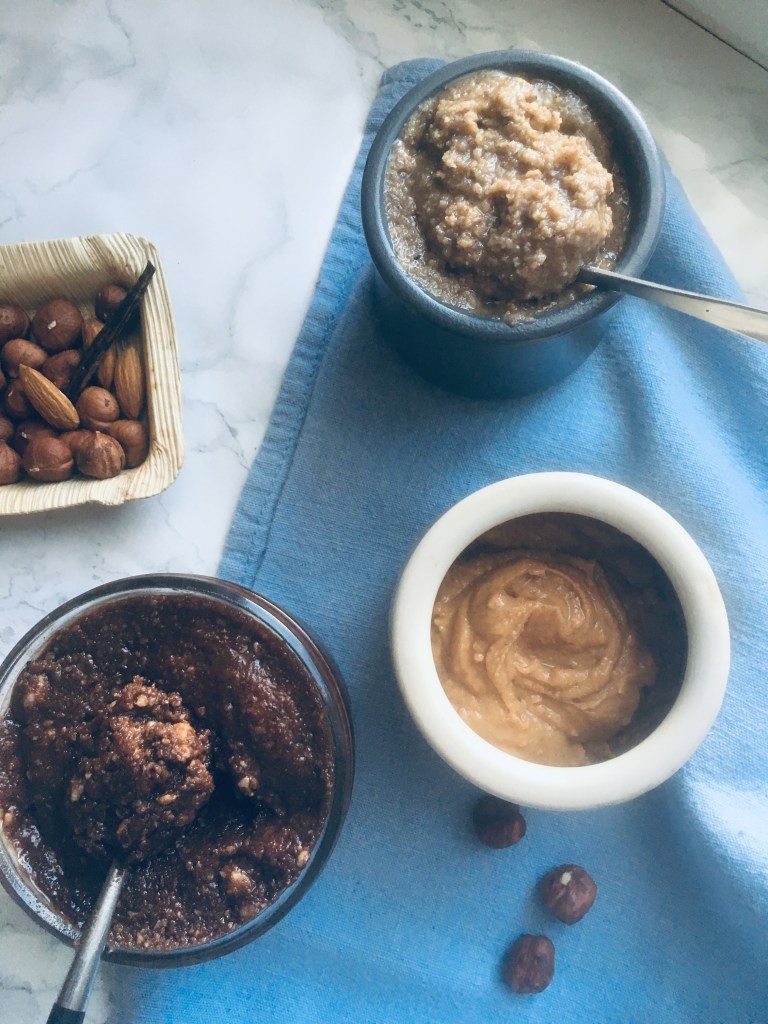 Kuvassa ylimpänä pekaanipähkinävoita, keskellä maapähkinävoita ja alimpana sokeritonta ketonutellaa, jonka ohje löytyy täältä.