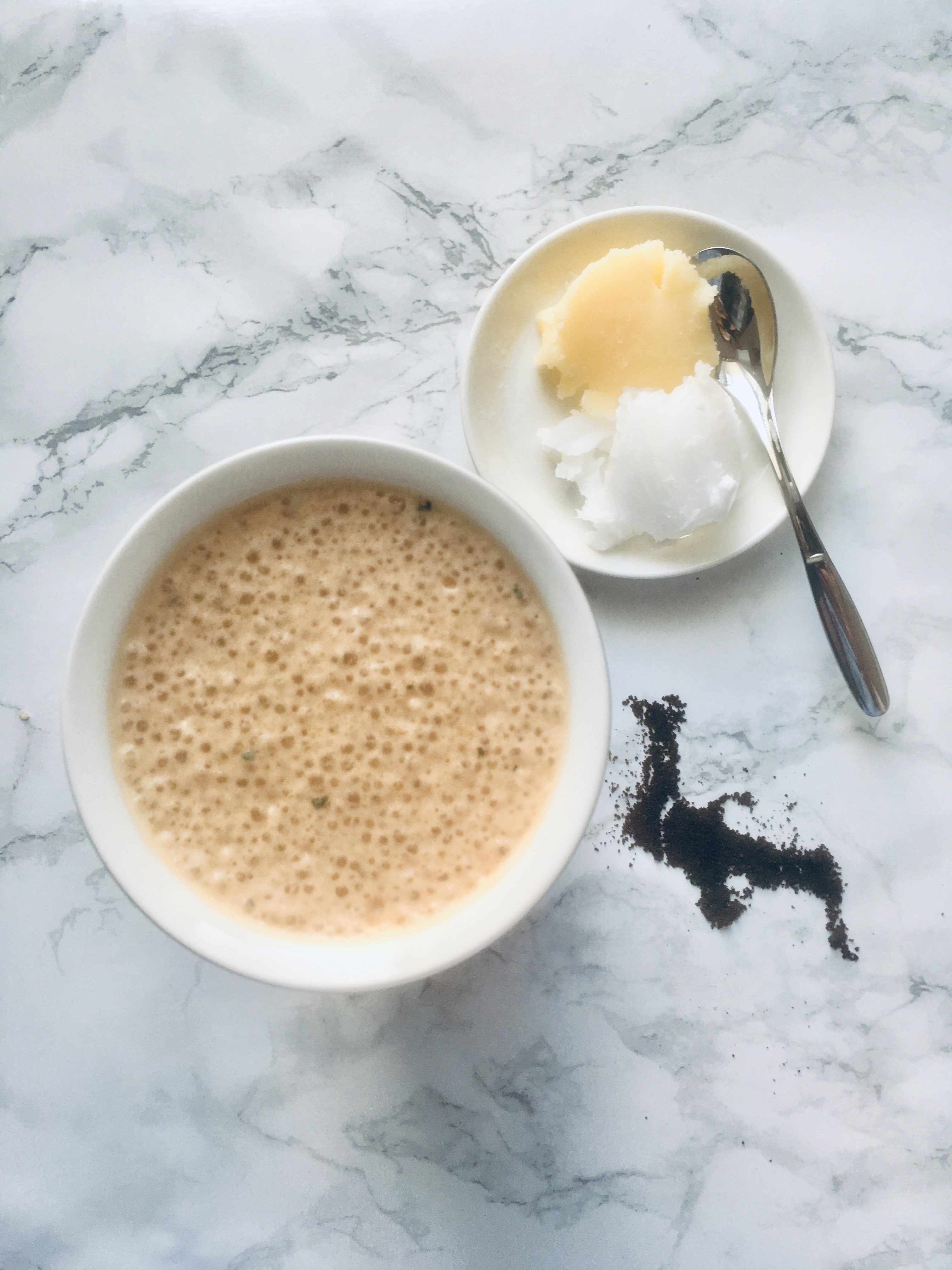 - Mittaa ainekset korkeaan lasiin. Itse käytin tällä kertaa 1 rkl gheetä ja 1 rkl kookosöljyä. (Add the ingredients into tall container or coffee mug.)