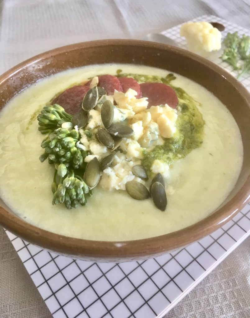 - Lisää kerma ja juusto. Soseuta sauvasekoittimella. Kuumenna. (Add the cream and blue cheese. Blend. Heat up.)