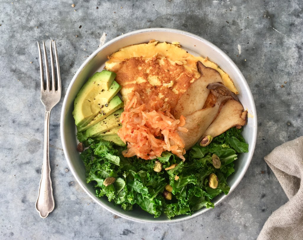 - Paista hienonnettu lehtikaali, munakas ja viipaloidut sienet. (Fry chopped kale, omelette and sliced mushroom.)