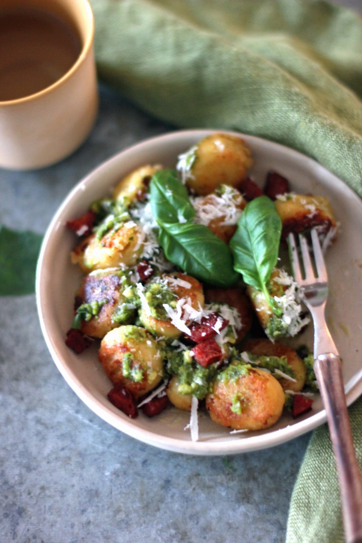 Gnocchit on ollut viime aikoina ruokatrendien nosteessa ja vaikkakaan itse en usein gnoccheja laita (, koska olen laiska ruoanlaittaja), on ne aina ollut minun ja lasten mieleen ja Italiassa matkustellessa gnoccheja on syöty paljon. Gnocchit ovat ikäänkuin perunasta tehtyä pastaa. Niiden rakenne on parhaimmillaan pehmoinen ja hiukan vastustava. Pintaan paistetaan kullanruskea ja rapea kuori pannulla voissa ja valkosipulissa ja yksinkertaisimmillaan gnocchit tarvitsevat lisäkseen vain maukkaan voikastikkeen ja hiukan tuoreita yrttejä.