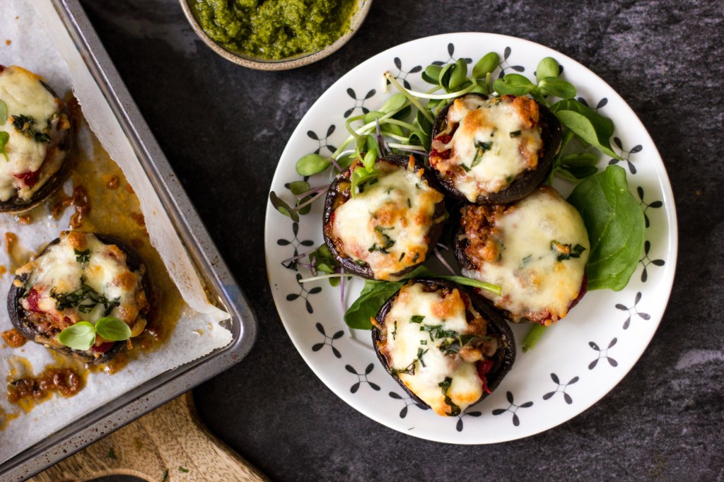 - Lusikoi jauhelihakastike sienten hatun sisään, (jos kastiketta jää yli tarjoa se sienten lisänä) ja hiukan pestoa. Jaa sienten päälle mozzarellaraaste.