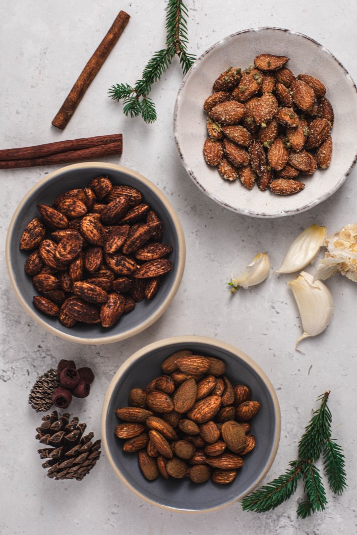 Kaada mantelit kulhoon ja lisää haluamasi mausteet. Sekoittele, kunnes mausteet ovat tarttuneet tasaisesti mantelien pintaan.