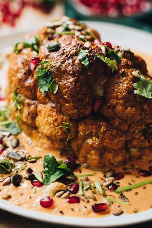 Mausteinen kokonaisena paahdettu kukkakaali on herkullinen lisäke erityisesti grillatulle kanalle ja vaalealle kalalle. Uunin lämmössä mehevöityneet mausteet sekoitetaan kerman kanssa herkulliseksi kastikkeeksi ja annos viimeistellään tuoreilla yrteillä, siemenillä sekä kauniin punaisilla granaattiomenan siemenillä (vhh).