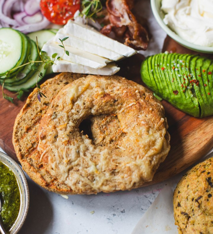 Tämä bageli meni jatkoon myös tavallisen vehnäbagelin rakastajalle. Rinkeleiden rakenne on hiukan pehmoinen ja hiukan sitkas ja ne toimivat tosi hyvin paahdettuina. Reseptin voi tehdä kokonaan ilman kananmunaa, mutta omaan makuun yksi kananmuna teki rakenteesta pehmoisemman ja hiukan kuohkeamman. Ravintoarvot reseptiin on laskettu ilman suluissa olevia raaka-aineita ja päällisiä.