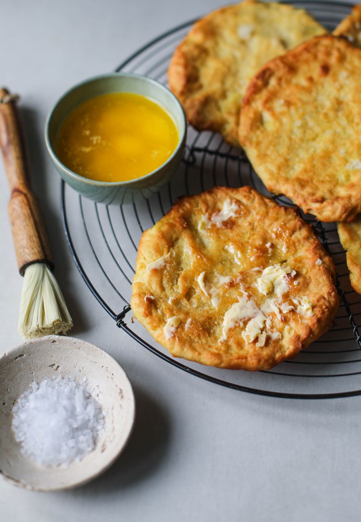 Voitele paistetut rieskat voilla, ripottele pinnalle sormisuolaa.
